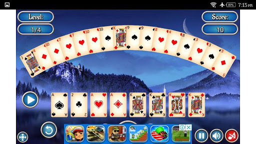 Crescent Solitaire. Move the cards from the crescent to the foundations. The kings are built down by suit up to aces and the aces are built up, also by suit, to kings. Use the shuffles when you have no more possible moves. The top card of each pile in the crescent are available to play on the foundations or the tableau. Only one card can be moved at a time and building on the tableau is either up or down by suit and can go round-the-corner (placing a king over an ace and vice versa).