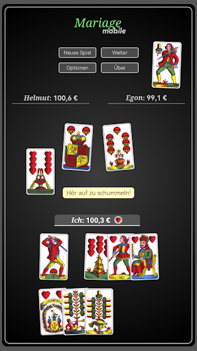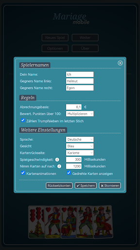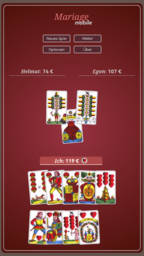 Mariage ist ein beliebtes Kartenspiel. Im Vergleich zum normalen Mariage ist das Spiel einfacher/entspannter, da dem Spiel keine anfängliche Erhöhung auf den Ausgang des Spiels vorausgeht. Es geht direkt mit dem Spiel weiter. Sie können die Namen der Spieler, die Bedenkzeit des Gegners oder ob eine gewonnene/verlorene Trumpfsieben im letzten Zug zählen soll, einstellen. Die geringe Größe der App ist ebenfalls ein Vorteil, da das Spiel selbst auf dem Server gespeichert ist (es wird automatisch heruntergeladen, wenn Sie es zum ersten Mal ausführen) und nur der Client-Teil auf Ihrem Telefon installiert ist.
