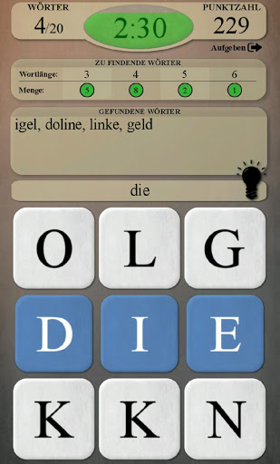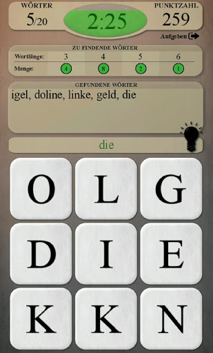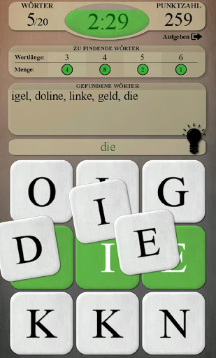 - Hinweis: Alle 20 Sekunden erscheint eine Glühbirne. Wenn du sie berührst, werden die ersten beiden Buchstaben eines noch nicht gefundenen Worts angezeigt (erster Buchestabe hellblau, zweiter Buchstabe dunkelblau)
