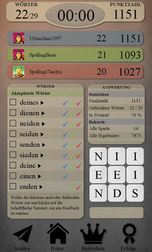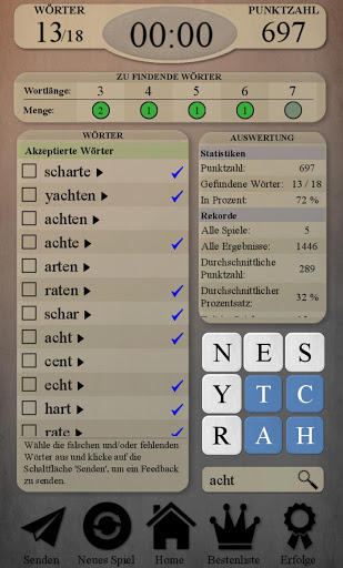 - Feedback: Auch wenn wir stets versuchen, unser Bestes zu geben, sind wir natürlich nicht perfekt. Auf unserem Feedback-Bildschirm kannst du uns schnell eine Rückmeldung senden, wenn du zum Beispiel ein falsches Wort findest oder wenn ein Wort fehlt. So hilfts du uns, das Spiel immer weiter zu verbessern.
