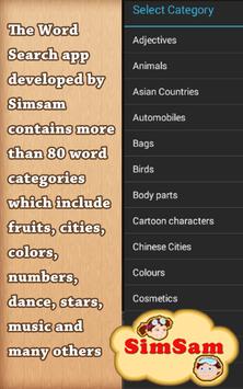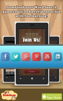 Die von Simsam entwickelt Wortsuche App enthält mehr als 80 Wortkategorien, die Früchte, Städte, Farben, Zahlen, Tanz, Stars, Musik und viele, viele andere. Darüber hinaus bieten wir 3 Schwierigkeitsstufen - und wenn Ihr Kind kann nicht ein Gitter er lösen / sie kann leicht zum nächsten zu bewegen. Wir bieten auch Wörter in verschiedenen Sprachen, die die App als eine Sprache-Learning-Tool als auch verdoppeln wird!