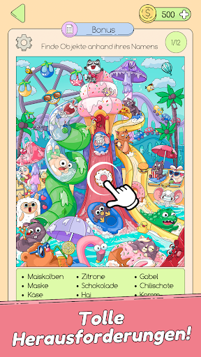 Find & Tap ist ein unterhaltsames, kostenloses und einzigartiges Wimmelbild-Spiel. Ziel ist es, Objekte in den handgezeichneten Bildern zu finden. Das Spiel findet an unterschiedlichen Schauplätzen statt – am Strand, bei einer Hundeshow und sogar in einem Geheimlabor! Erkunde Dutzende einzigartiger Orte und suche nach hunderten von versteckten Objekten. Die unterschiedlichen Aufgaben machen jedes Level zu einer echten Herausforderung für alle Liebhaber von Wimmelbild-Spielen! Du wirst dich anstrengen müssen, um alle Objekte zu finden, die wir versteckt haben.