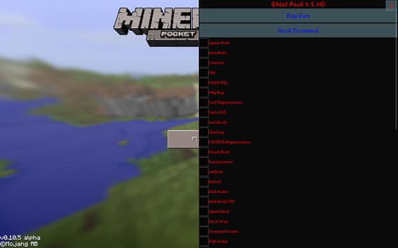Ghost Hack - First world hack for Minecraft Pocket Edition 0.10.X (for Android), it has lots of functions with like the PC version cheats such as Huzuni, Resilience, Nodus, Falcon, Brulitary and other...