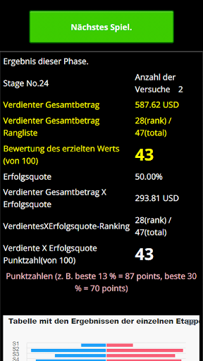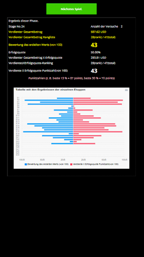 Das Spiel zeigt den Abweichungswert für jeden Handel an, so dass Sie Ihren Fortschritt bei jedem Handel überprüfen können. Die Rangfolge der Etappen wird in zwei Kategorien berechnet: Rangfolge des absoluten Werts und absoluter Wert/Anzahl der Versuche, die zum Überwinden der Etappe erforderlich sind, und wird auf einer 100-Punkte-Skala bewertet. (88 Punkte für die besten 12 %).