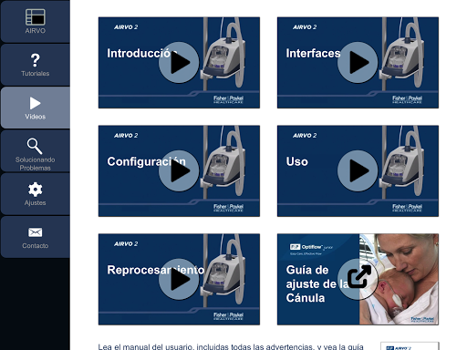 Usted pued cambiar los ajustes, niveles de oxígeno y simular alarmas. Hay tutoriales de ayuda con los conceptos básicos, además de vídeos cortos de ayuda paso a paso para guiarle en el funcionamiento de AIRVO2.
