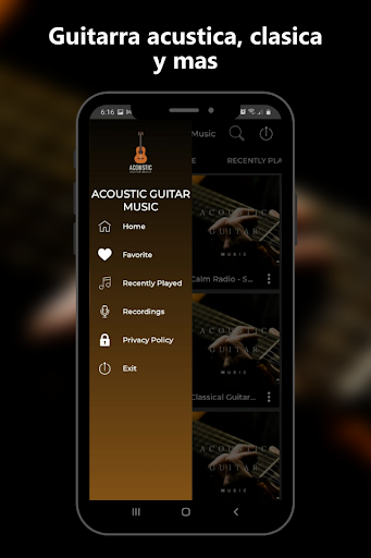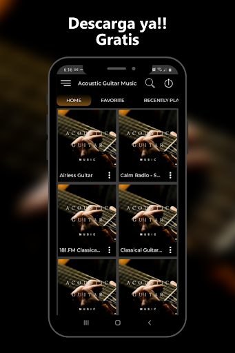 Esta aplicación de música está cargada con numerosas estaciones de radio con una variedad de musica de guitarra acustica, transmitida las 24 horas del día, los 7 días de la semana.