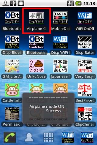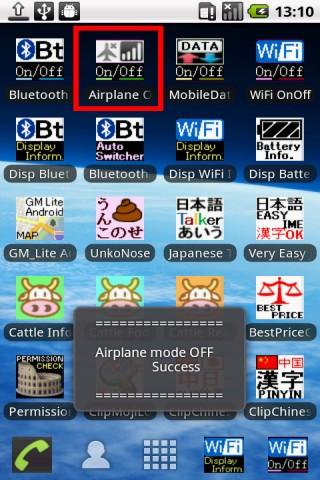Airplane mode OnOff toggle switcherVery Simple control software Airplane OnOff Toggle switcherAirplane mode OnOff Toggle switcherAirplane OnOff Toggle switch.Very Simple Airplane mode Control Software support SDCard InstallAndroid 2.2 FroyoAPK size 9KB Very Small Airplane mode ON to OFF.Airplane mode OFF to ON.http:www.neko.ne.jpfreewingandroidCopyright c 2011 free WING,Y.Sakamoto