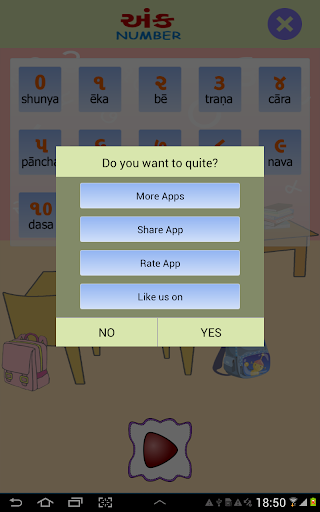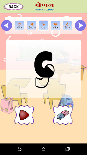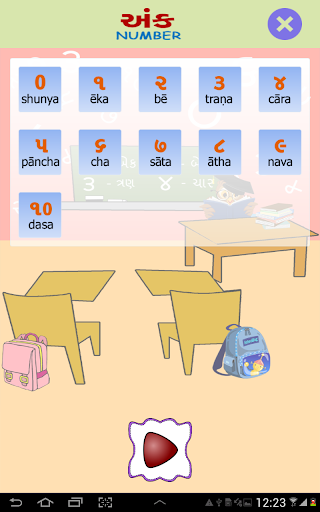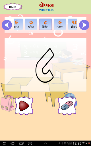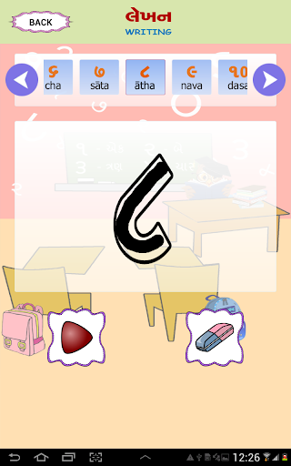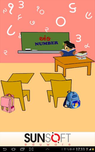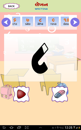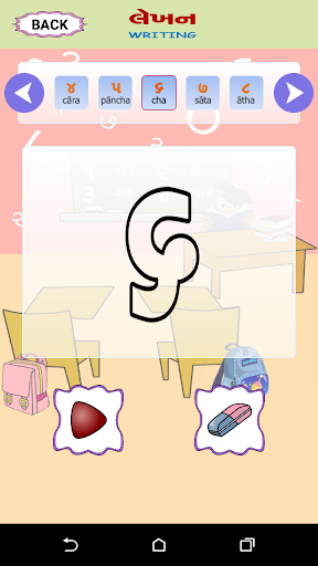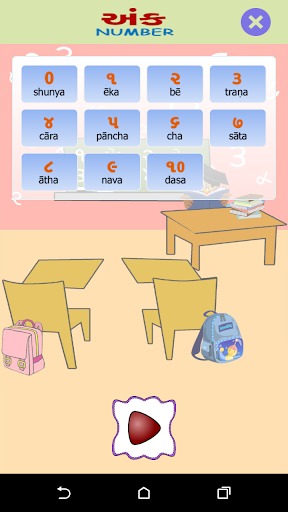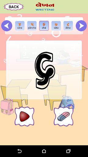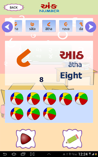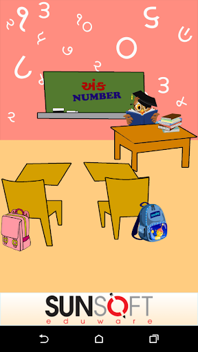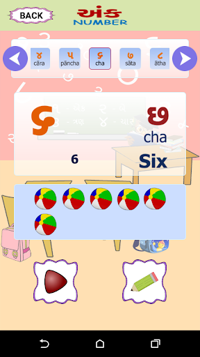 Esta pantalla tiene una imagen visual de los números de Gujarati, la forma en que se lee en inglés y se puede escuchar cómo suene el número. . También le da una imagen de un objeto que representa ese número particular. P.ej. El Dígito Gujarati 4 se escribirá como ચાર, junto con su contraparte inglesa 4. Junto con el dígito habrá una representación pictórica de 4, tal vez cuatro bolas para que el usuario pueda relacionar el número correctamente contando. Una forma fácil de aprender con el sonido y la ilustración de la imagen.