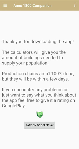 Anno 1800 Companion te ayuda a optimizar su experiencia de juego.La aplicación es un libro de referencia y una herramienta para calcular el consumo de bienes. Simplemente ingrese sus números de población actuales y la aplicación le indica cuántos edificios de producción de un tipo necesitan para satisfacer a su población.