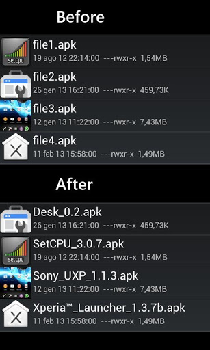 ApkRenamer renames automatically apks file in your device. If you have an apk file with a name you do not know, this application allows you to rename it with its original name using various options of renaming.