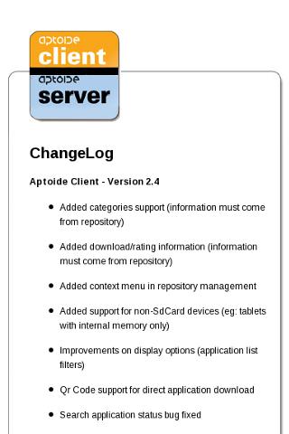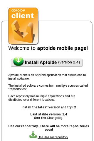Application that provides access to news and installation of Aptoide. Aptoide client is an open source Android application alternative to Google Market that allows one to install software. The installed software comes from multiple sources called "repositories". Aptoide is compliant with Apktor, Blapk Market and other Aptoide-derivatives. Unlike Applanet and aFreeware, the Aptoide repositories has almost no downtime and it can be browsed offline.If you want to setup your own repository, visit: http://bazaar.bazaarandroid.comRecent changes:- Icon fetching process options(bandwidth saving): + Always fetch icons (3G and wifi + Fetch only if connected by wireless + Never fetch icons- Screenshots shown when available- Extra application information (extras.xml) fetched and parsed in background- Minor bug fixes for improved stability- Special HTML characters bug fixed- Applications list ordering bug fixedcontent rating: Everyone