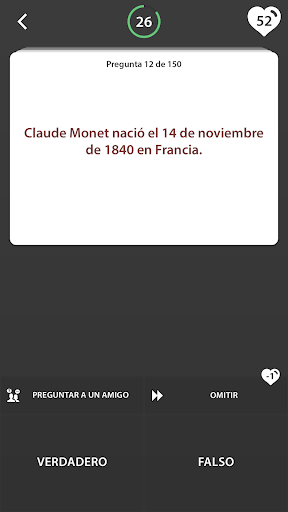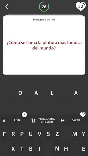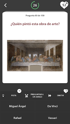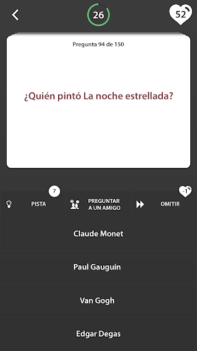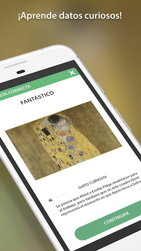 🎨¿Estás listo para lucir tu conocimiento en las preguntas que hemos preparado en Quiz de Arte en Español? En estos juegos de quiz tendrás que adivinar nombres de pintores, de obras o contestar cosas relacionadas con la historia del arte. Esta nueva app de teste de artes con un montón de preguntas de trivia con respuesta te mantendrá entretenido por horas. Las preguntas de trivia sobre el arte jamás habían sido tan divertidas, descubre a tu artista oculto con los juegos de quiz y aprende algo nuevo en el camino. ¡Este cuestionario de arte es increíble! Únete a los fanáticos de las preguntas de trivia y sorprende a tus amigos con los datos que aprenderás con esta trivia de arte! ¡Descarga ya Quiz de Arte en Español!