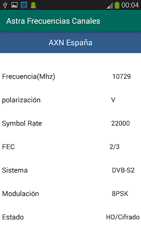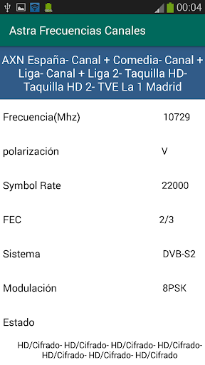 • Información detallada para cada canal (frecuencia - Polarización - SR -FEC -Modulation -Sistema -. Estado del canal (SD o HD / cifrado o Borrar))