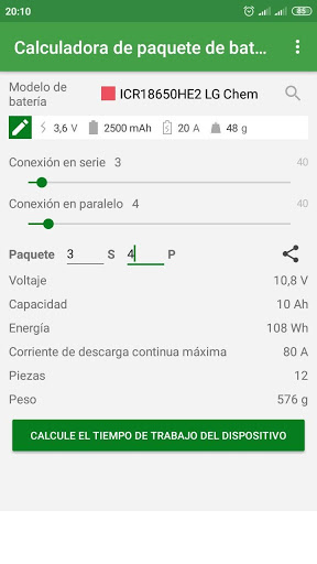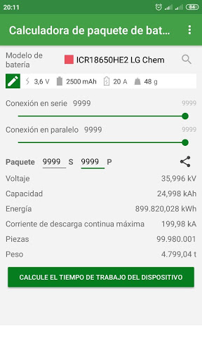 La aplicación le permite calcular paquetes de batería de hasta 9999S 9999P - Casi 100 millones de baterías. Lo que le permitirá calcular paquetes para bicicletas eléctricas y paquetes tan grandes como para coches eléctricos (EV).