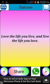 This is social app which contain collection of best statuses and also contain to share them among social media and set up your own statuses in whats-app,line...etc