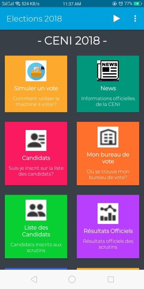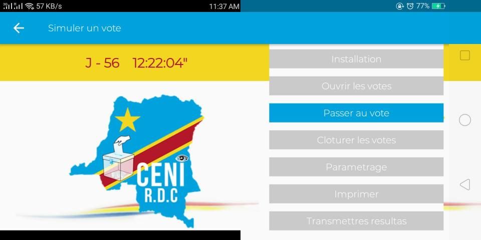 Application permettant a la CENI RDC d’être en contact avec les électeurs et offrant une une simulation de vote pour habituer ces derniers a l'utilisation de la machine a voter. On y trouve comme rubriques