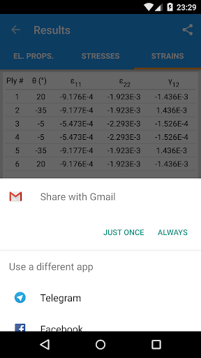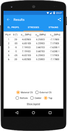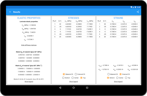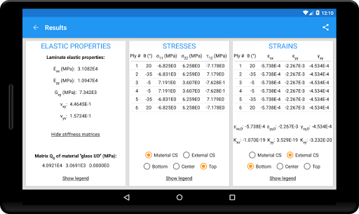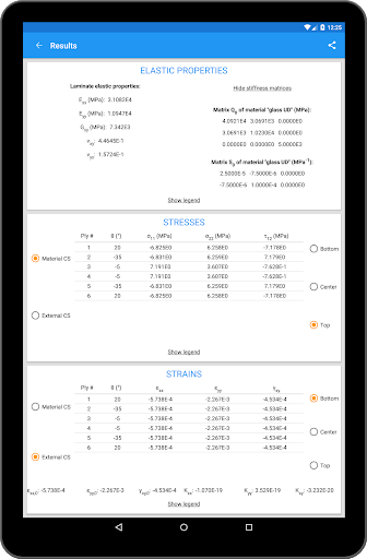 La aplicación calcula las propiedades elásticas del laminado y, si se han definido las cargas,Las tensiones y cepas en cada capa, en los sistemas de coordenadas externos y materiales.Todos los datos se pueden exportar en formato de texto para una mayor elaboración.