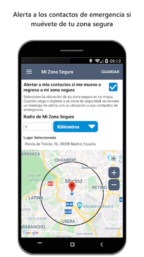 • Avise a mis contactos de emergencia si me mudo fuera de mi zona segura: Deje que sus seres queridos sepan sobre su estado de seguridad. Encierre en un círculo su ubicación de zona segura en un mapa. Cuando vaya más allá de su zona segura o regrese, se enviará un mensaje de alerta a sus contactos de emergencia a su ubicación.