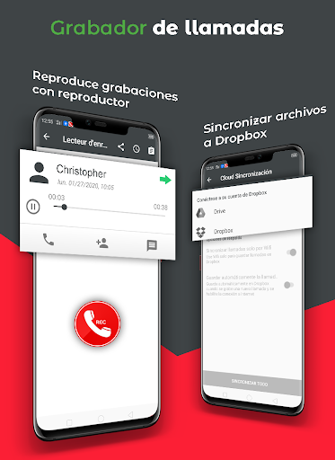 Todas las llamadas telefónicas se graban en su teléfono y tiene la capacidad de sincronizar archivos con Dropbox y Drive.