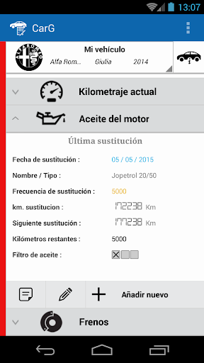 * CarG – App de gestión de vehículos puede gestionar infinitas entradas básicas para infinito número de ve ículosy calcular su progreso teniendo en cuenta el kilometraje actual. Esas entradas pueden ser: