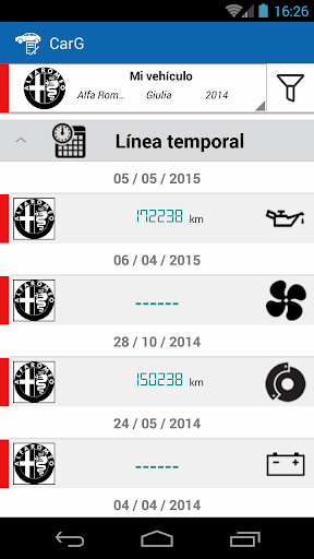 * CarG – app de gestión de vehículos tiene una sencilla ventana de linea temporal para mostrar todas las entradas o entradas filtradas para uno o todos sus vehículos