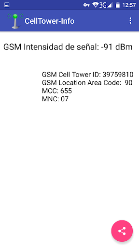 Esta aplicación android muestra la información de la torre de celda (móvil) actualmente conectada como: Fuerza de señal GSM, ID de celda GSM (CID) y Código de área GSM (LAC). También el código de país móvil (MCC) y el código de red móvil (MNC). Se utiliza principalmente para depurar problemas de conectividad celular, pero lo usa de cualquier manera que te guste :).