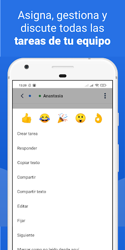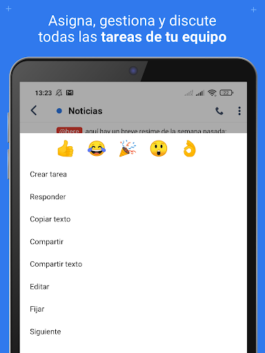 - Otras funciones de colaboración para tu equipo: @menciones para usuarios y equipos, GIF y emojis, estado de en línea, acciones y reacciones para mensajes y mucho más.