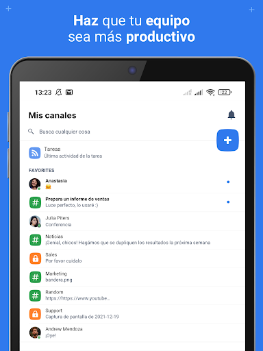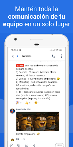 - Mensajería instantánea entre todos los miembros del equipo. Mensajes individuales, canales públicos y privados.