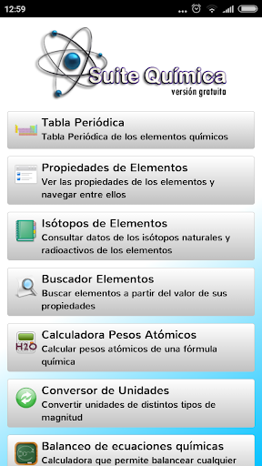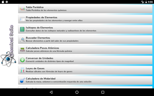 Aplicación educativa sobre química, distinta a los típicos programas que simulan la tabla periódica, ya que se trata de una aplicación con numerosas aplicaciones químicas y además se encuentra completamente en español. Su gran base de datos de información, y sus numerosas utilidades y opciones hacen de esta aplicación una completa suite de educación química. La aplicación contiene la siguiente funcionalidad:
