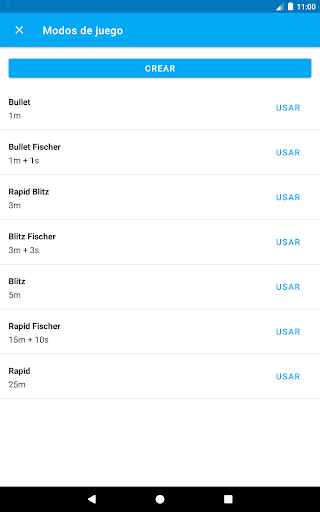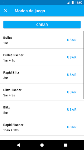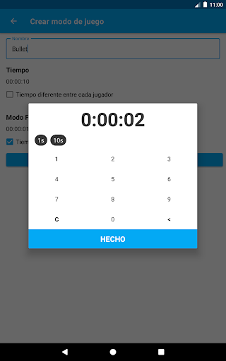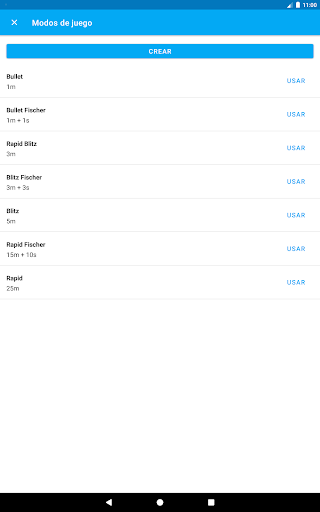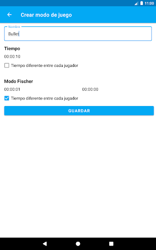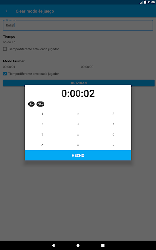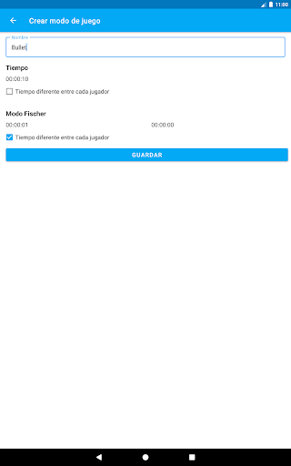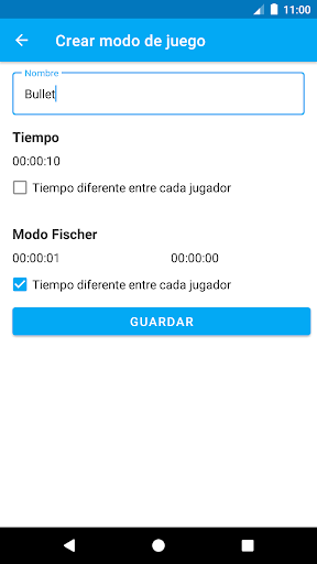 Los siguientes tiempos están preinstalados: 1m, 1m 1s, 3m, 3m 3s, 5m, 15m 10s y 25m. Puede añadir rápidamente sus propios modos de tiempo. También se admiten diferentes tiempos por jugador.