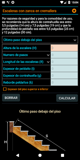 La calculadora de escaleras clásica lo ayuda a calcular sus escaleras de forma rápida, precisa y sin limitación de cuántos pasos desea tener. Todo lo que tiene que hacer es poner sus medidas deseadas en la aplicación y presionar el botón de calcular, y su resultado aparecerá de manera instantánea y estará listo para ser utilizado para construir su plano de escaleras.