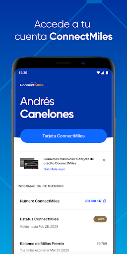 Inicia sesión en tu cuenta de ConnectMiles para ver los viajes que tengas asociados a tu perfil y revisar tus millas premio, la calificación de estatus para el próximo año y las actividades más recientes. Además, obtén acceso rápido a tu tarjeta ConnectMiles.