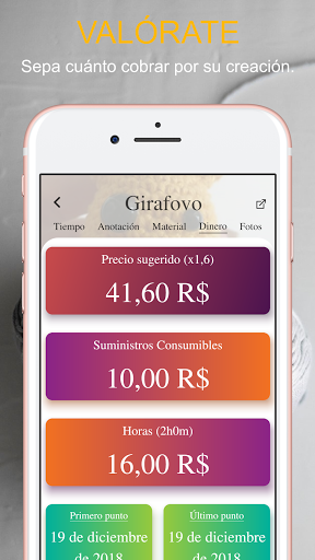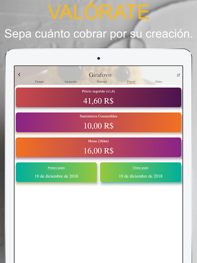 Añada la información de los materiales consubmíbles (hilos, ojos, etc) para que el app pueda ayudarte tambien a calcular el precio del trabajo.