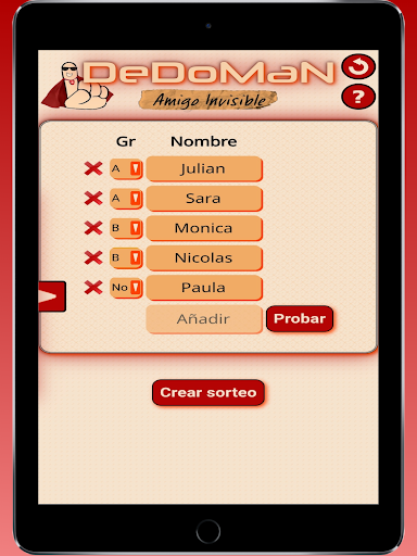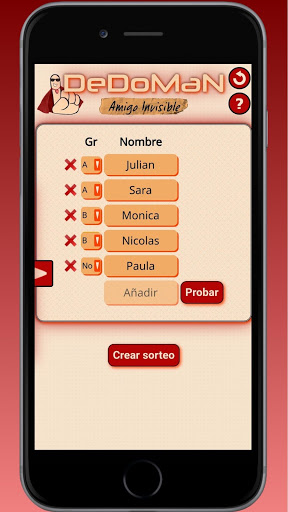 Introduce una lista de nombres y Dedoman los relacionará aleatoriamente. Puedes definir grupos de forma que las personas que pertenecen al mismo grupo (o equipo) no pueden ser asignados entre sí. Muy útil por ejemplo cuando sois un grupo con varias familias o parejas y no queréis que se hagan regalos dentro de la misma familia.