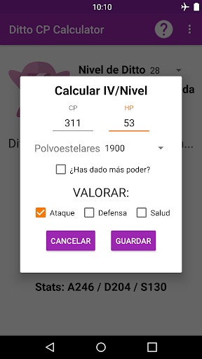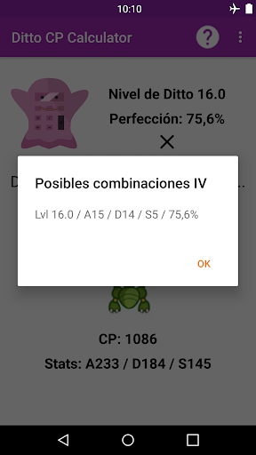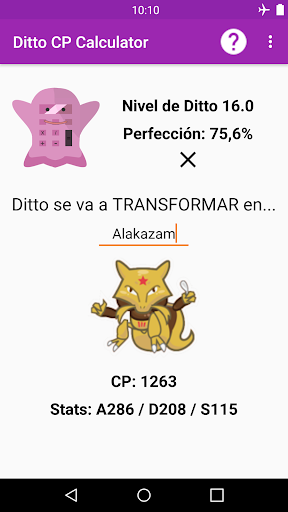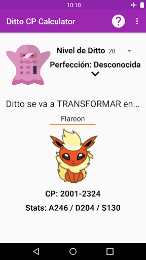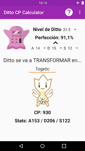 Con esta app, podrás calcular el nivel y perfección de tu Ditto para descubrir el CP que tendrá cuando se transforme en el Pokemon enemigo. También podrás ver las stats (estadísticas) que tomará cuando esté transformado.
