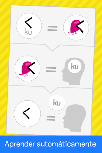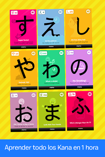 Cada pantalla presenta un Kana junto con una pista mnemotécnica y un audio clip. Lee la pista, escucha el audio y aprenderás Hiragana y Katakana sin esfuerzo.