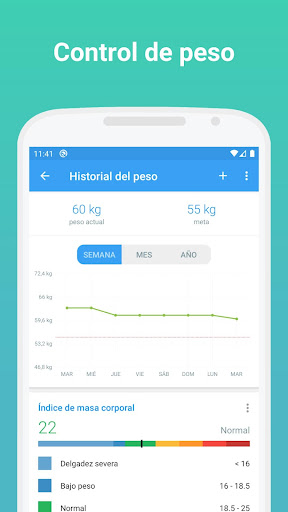 Puede llevar un historial de peso y de índice de masa corporal. Gran herramienta para perder peso.