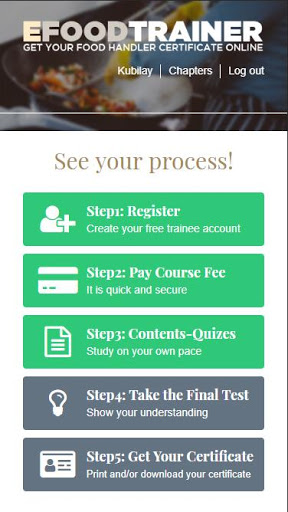 Efoodrainer Food Handler Se emitirá solo cuando se cumplan todos los requisitos establecidos por aprendiz. Se requiere un autoestudio de 2 horas del material del curso y sigue la prueba final para evaluar los resultados de aprendizaje.