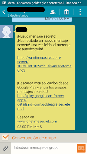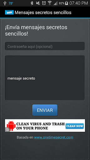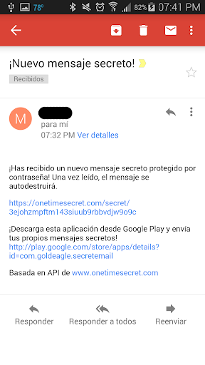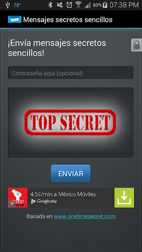 Esta aplicación súper sencilla, pero muy potente le facilitará la seguridad de su información sensible en sus correos electrónicos, SMS y salas de chat. Basado en el servicio API de código abierto proporcionado por el popular sitio web OneTimeSecret.com esta aplicación permite enviar mensajes secretos cifrados que se auto-destruyen una vez leídos. No tendrá que preocuparse nunca más de que algún hacker entre a sus cuentas y lea sus mensajes privados.