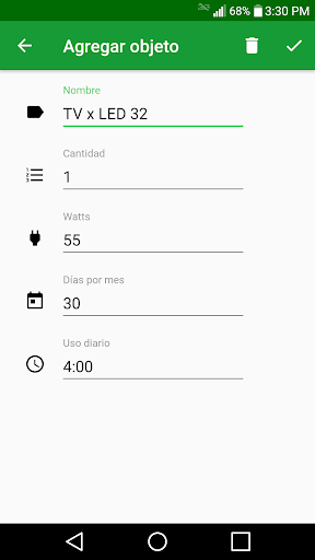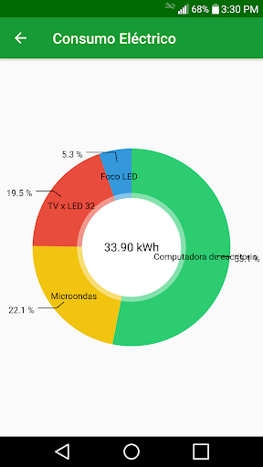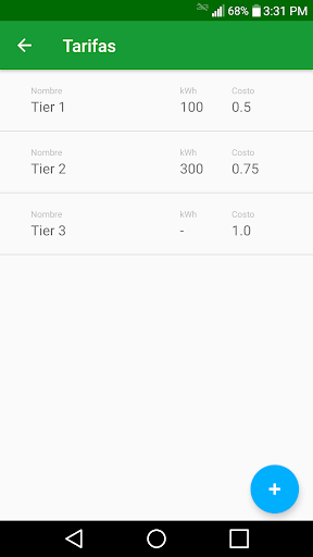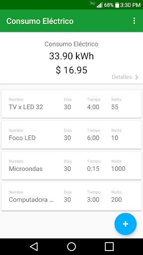 La aplicación calculará el consumo eléctrico mensual en kilowatts hora (kWh). Agrega las tarifas electricas validas en tu área para conocer el costo aproximado de tu factura mensual.