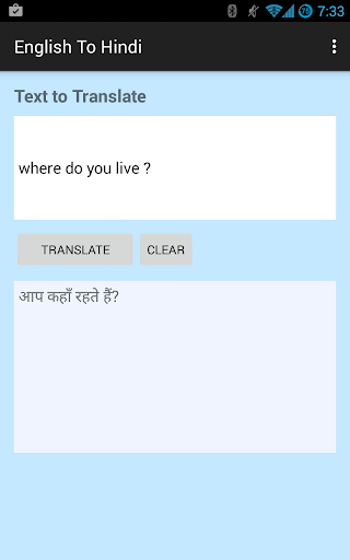 Sencillo y rápido inglés a hindi y hindi a la aplicación de Android del traductor inglés.Simplemente escriba o pegue el texto en inglés o hindi y obtenga los resultados deseados en Presione el botón.