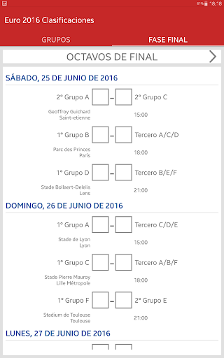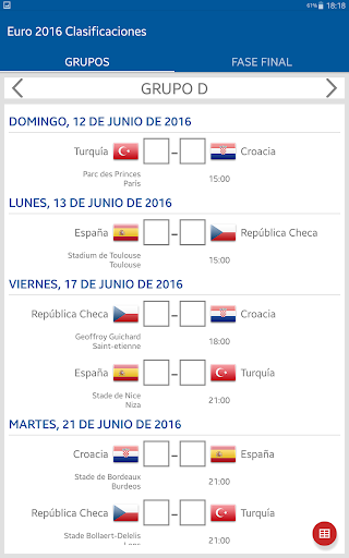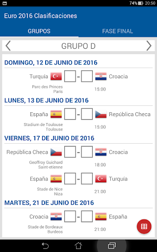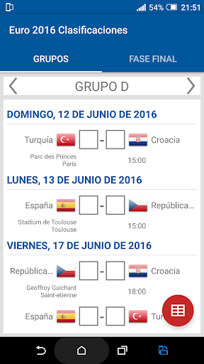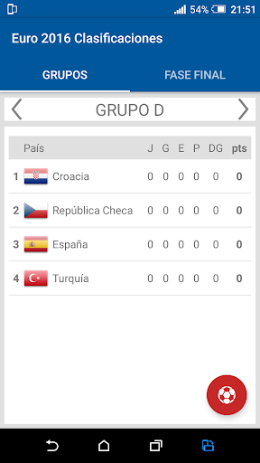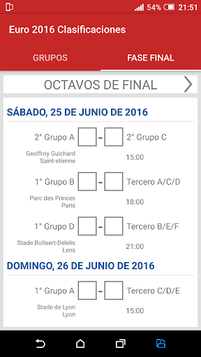 Solo tienes que introducir sus resultados, y la aplicación se construye todos los cuadros para obtener el que los equipos llegar a los playoffs. Además, la aplicación cuenta con un calendario de partidos. Realizar un seguimiento de los juegos y llenar su propia tabla Euro 2016