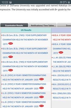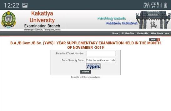 from Kakatiya University portal, where students can get examination results, notifications/time table, downloads,forms pertaining to their academic session etc to their Android mobiles. result can be obtained by entering their hall ticket Number when the university declare/ release.