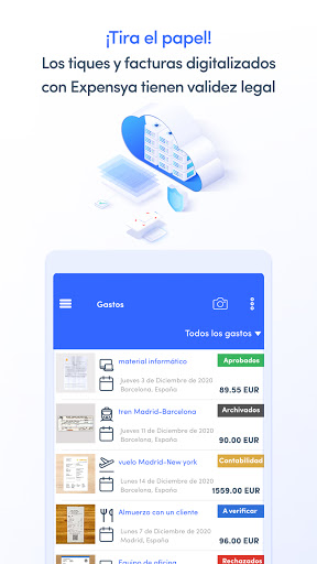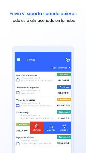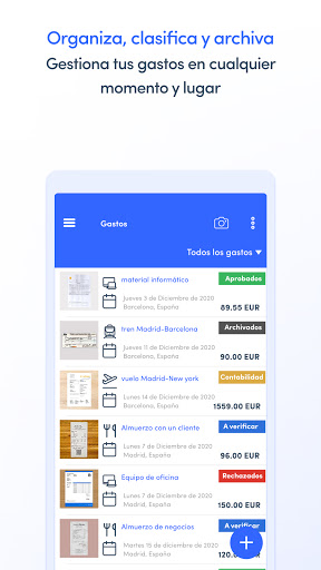 • Gestión de todas las etapas del viaje: Gestiona todo tipo de gastos antes, durante y después del viaje, genera autorizaciones de viajes para planificar los desplazamientos profesionales con facilidad y añade los informes de gastos con una foto gracias a la digitalización inteligente.