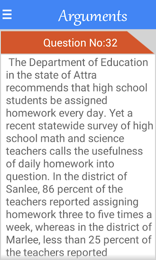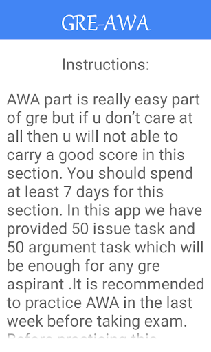 This app contains 50 issue tasks and 50 arguments for preparing gre AWA sections with proper instructions....