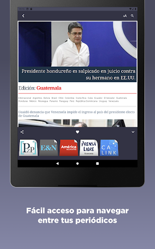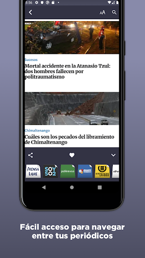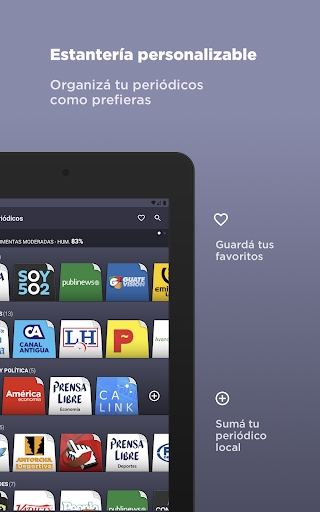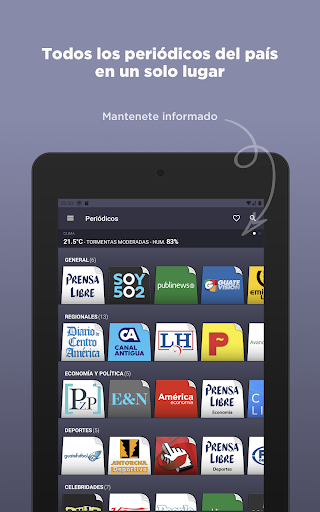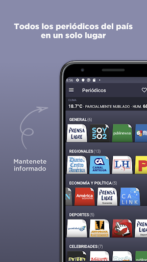 Los periódicos se encuentran categorizados y agrupados para una mejor navegación. De esta forma, Ud. podrá leer prensa libre y, desde ese mismo periódico, podrá trasladarse a diarios de la misma categoría (como soy 5o2 o guate vision) desplazando hacia arriba la barra inferior. Así, podrá comparar cómo abordan un mismo tema los diferentes periódicos.