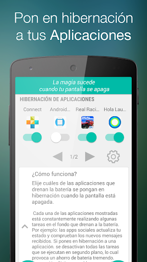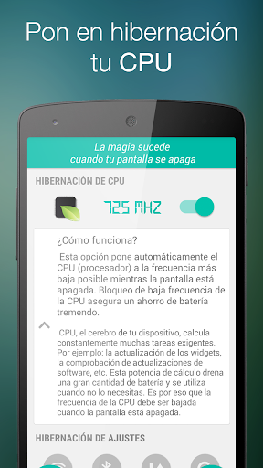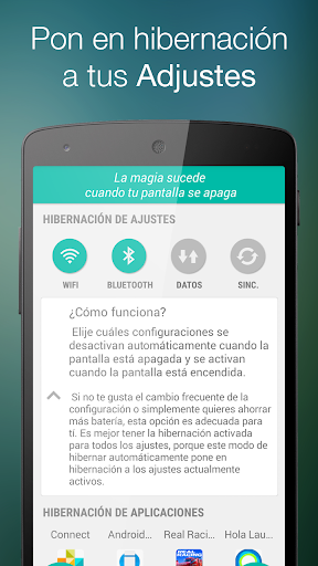 Los dispositivos Android están diseñados para trabajar todo el tiempo, incluso cuando no los utilizas. Hibernation Manager ayuda a ahorrar batería cuando no utilizas a tu aparato. Cuando la pantalla se apaga, pone en hibernación a tu procesador (CPU), los ajustes e incluso aplicaciones para ahorrar energía de tu batería.