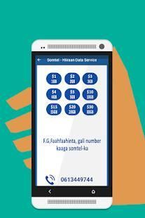 Waxaad ka iibsan kartaan xirmooyinka Somtel iyo SomNet. Hada kadib uma baahnid in aad cid la hadashid ama qarash telefan ku bixisid si laguugu shubo xirmo Somtel ama SomNet hadii aad isticmaashaan Hiiraan Data Service app. Sidoo kale ka waxaad ka heli doontaa Adeegyada EVC Plus, ANFAC iyo Artimet