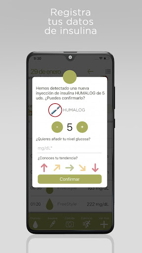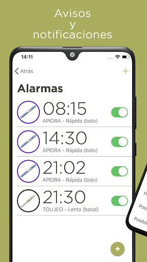 ¡ALARMAS Y AVISOS! Configura recordatorios para ponerte la insulina, avisos para medirte la glucosa después de inyecciones de insulina rápida y mucho más.