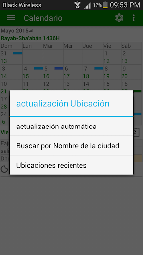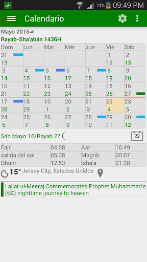 La aplicación proporciona una vista mensual del calendario gregoriano y el respectivo calendario islámico(Hijri) (التقويم الهجري)